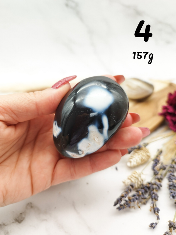 Man sagt, dass der Orka Achat eine starke de Energie hat, die Ausdauer und Geduld fördert und für inneren Frieden sorgt, somit ideal bei der Meditation.