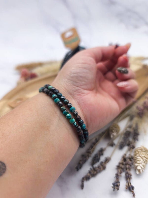 Dieses feine Armband aus facettierten Chrysokoll-Würfeln verbindet erdige Grüntöne mit zartem Türkis, ein Symbol für Ausgeglichenheit und innere Wahrheit.