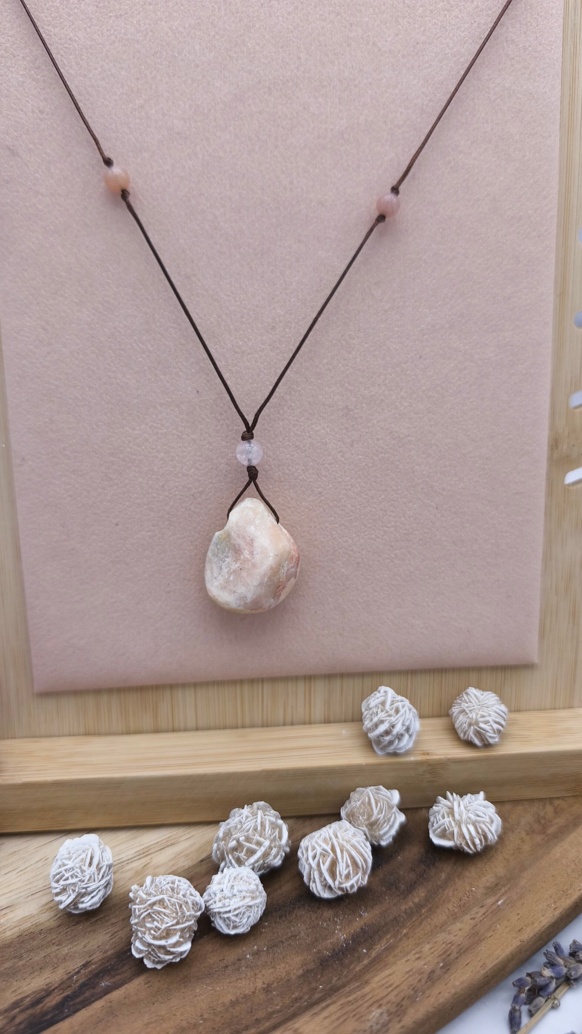 Im Mittelpunkt steht ein Baryt-Anhänger, ergänzt durch eine Rosenquarzperle und eine Mondsteinperle.