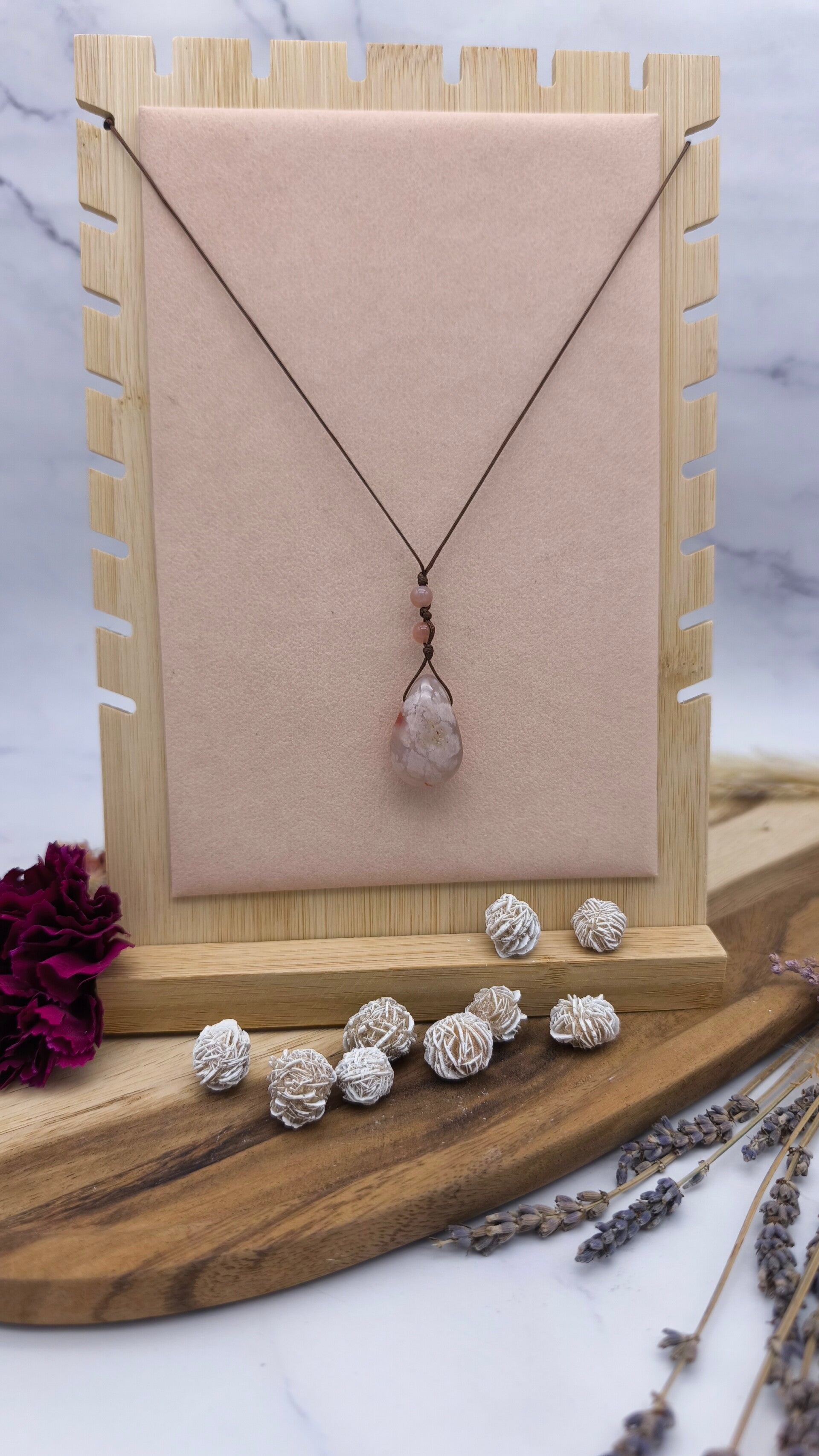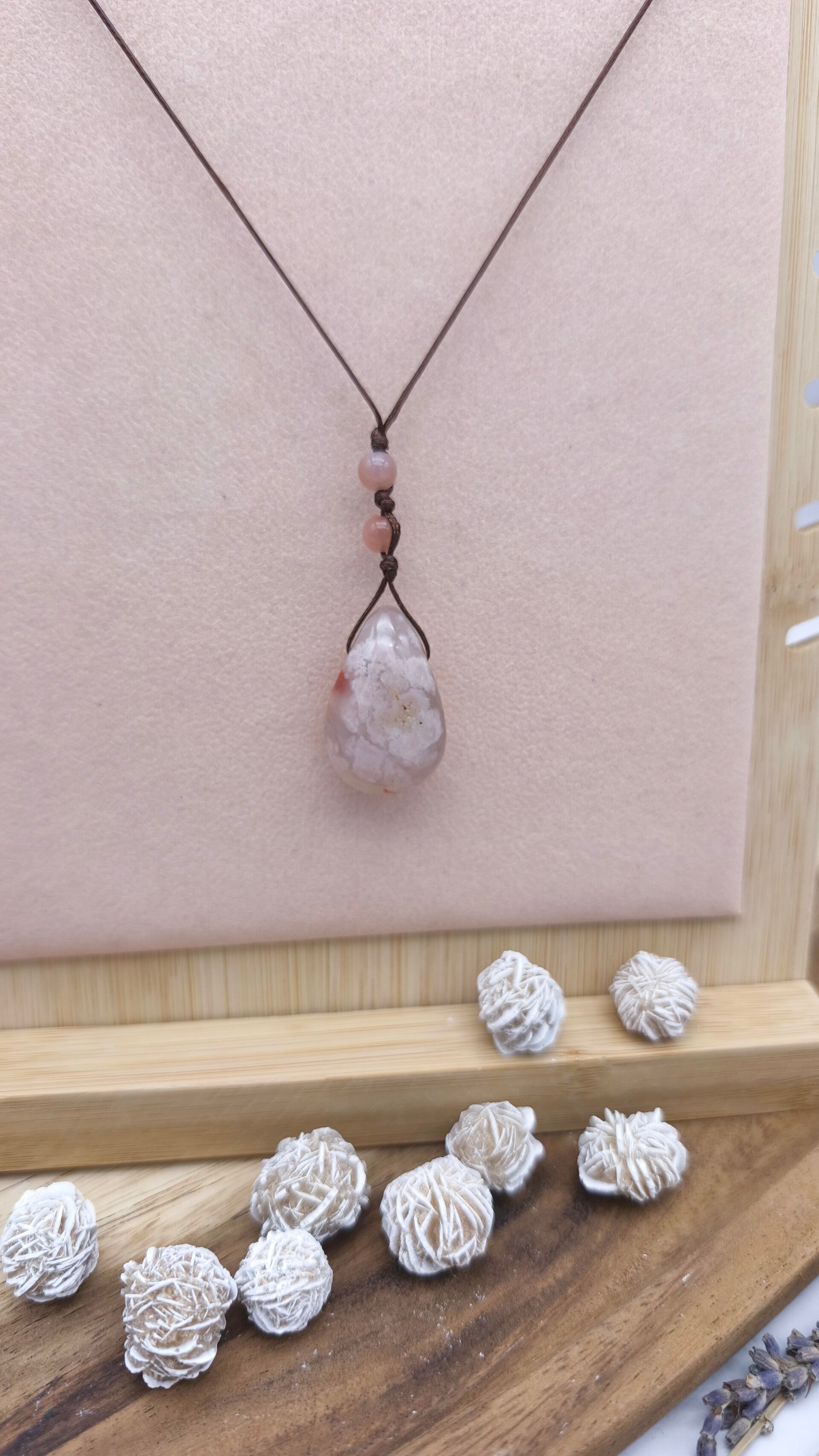 Im Mittelpunkt steht ein Kirschblüten-Chalcedon-Anhänger, ergänzt durch Mondsteinperlen.