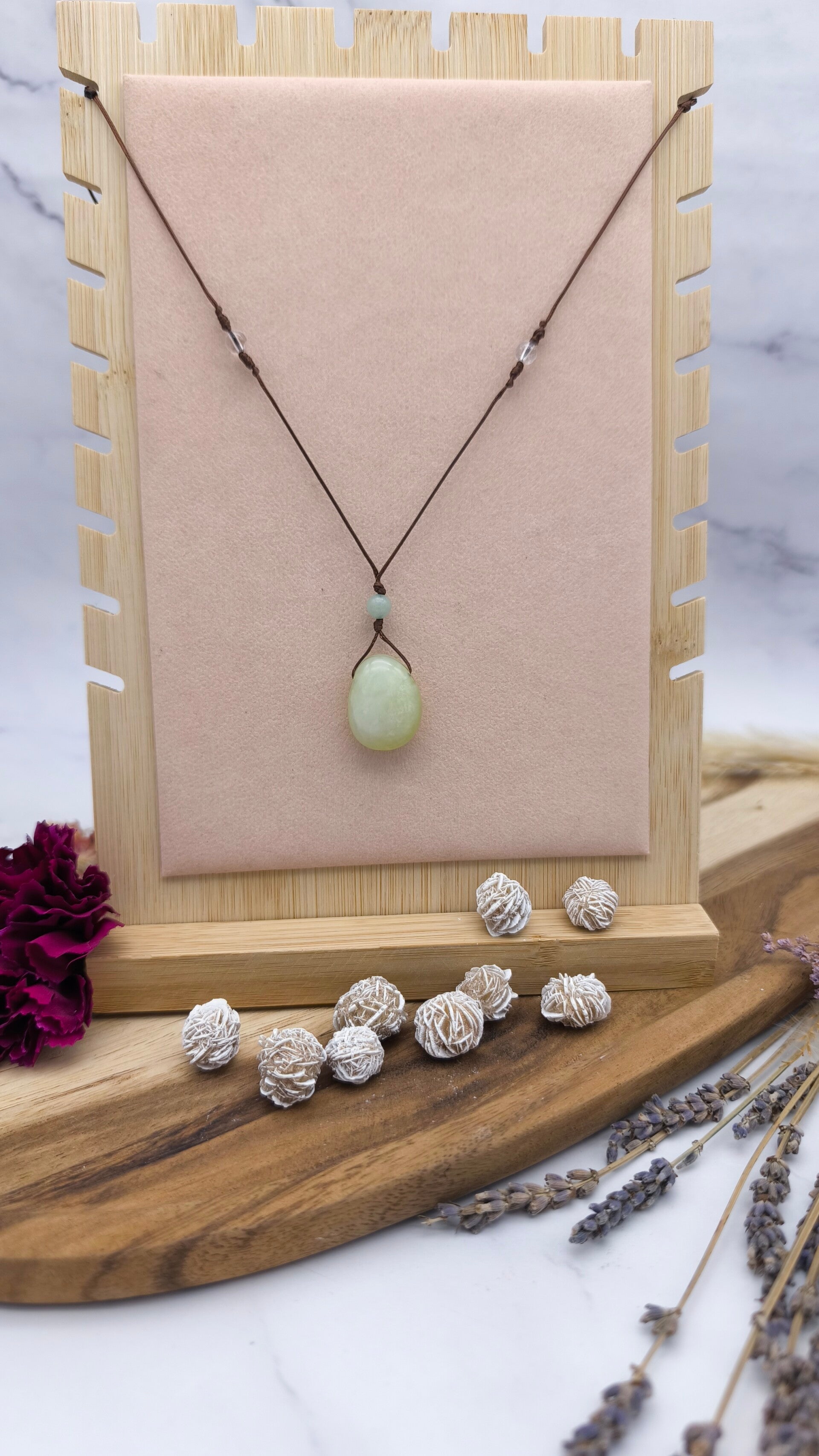 Der Mittelpunkt dieser Kette ist ein Serpentin-Anhänger, ergänzt durch Amazonit und Bergkristallperlen.