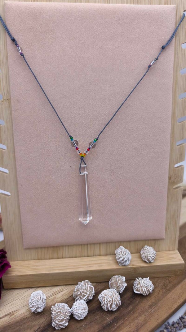 Der Mittelpunkt ist ein Bergkristall-Anhänger in Vogelkristallform, ergänzt durch Bergkristallperlen und zahlreiche hochwertige Miyuki-Glasperlen, die der Kette feine Farbakzente und Lebendigkeit verleihen.