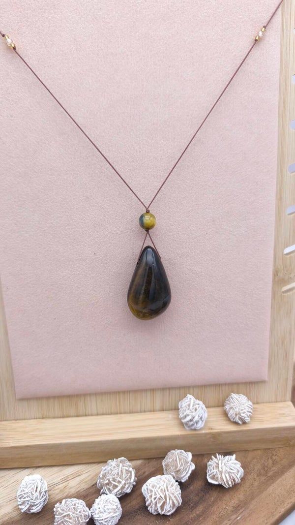 Im Mittelpunkt steht ein Tigerauge-Anhänger, ergänzt durch eine Tigerauge-Perle, facettierte Perlen und feine Miyuki-Glasperlen, die der Kette eine dezente, elegante Struktur verleihen.