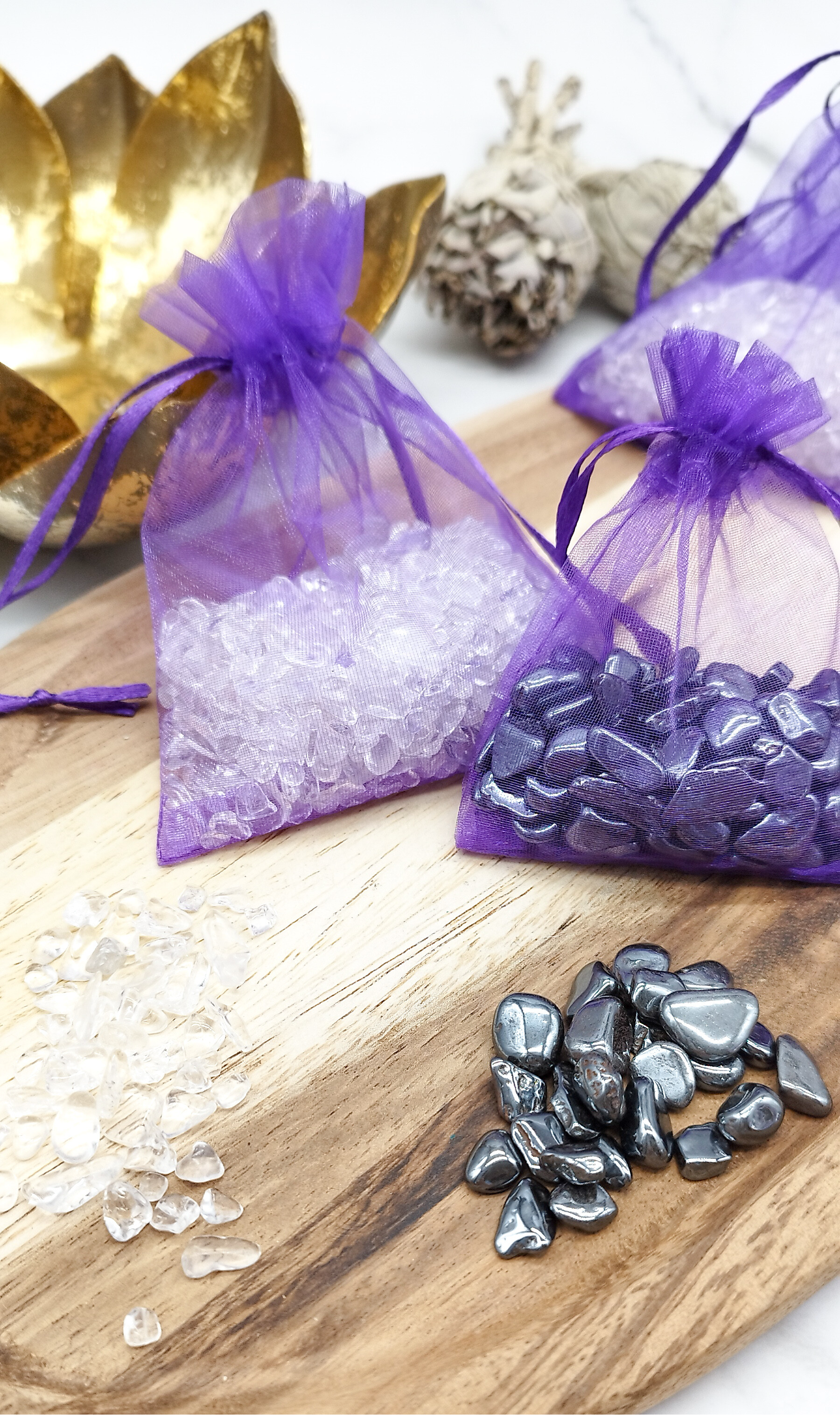 Dieses wundervolle Set enthält 2 Organzasäckchen mit Bergkristall und Hämatit zum Auf - und Entladen deiner Kristalle.